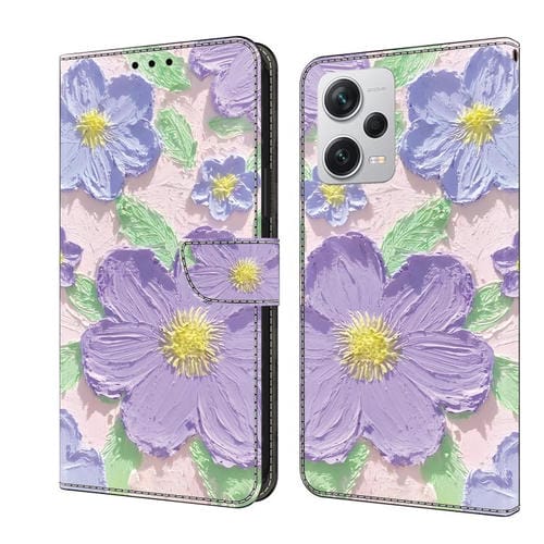 Funda de Cuero Pintada a Mano para Redmi Note 12 Pro+ (Pintura al Óleo de Flores Moradas)