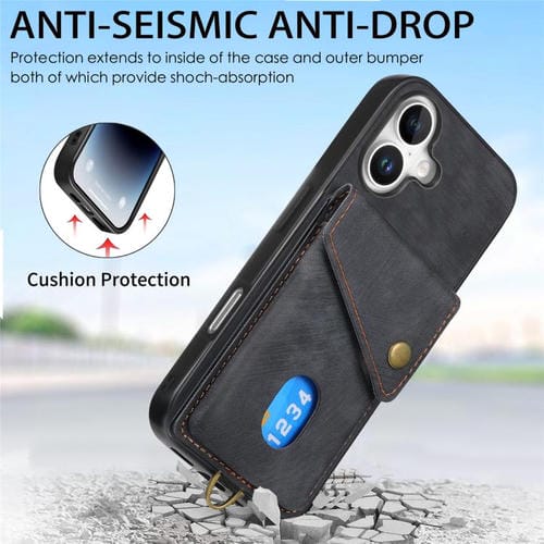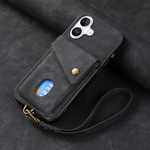 Funda de cuero plegable con tarjetero retro para iPhone 17 con correa (negra)