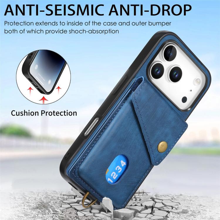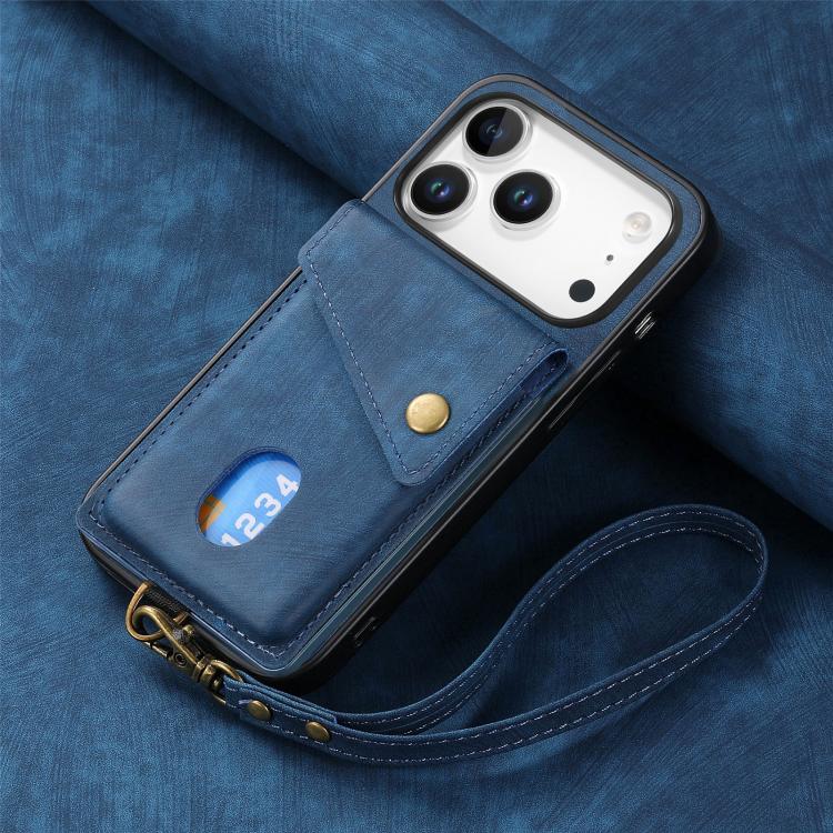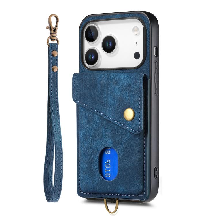 Funda de cuero plegable con tarjetero retro para iPhone 17 Pro Max con correa (azul)