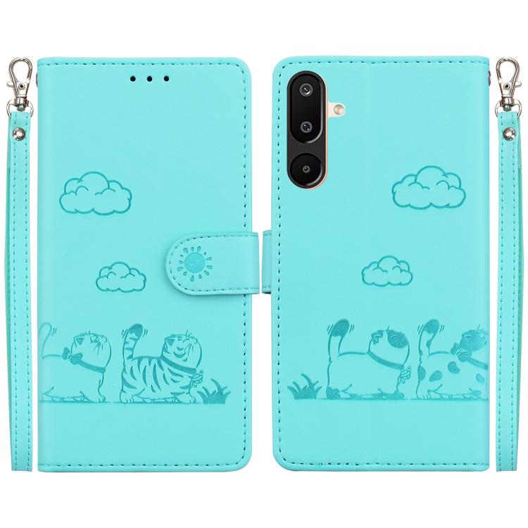 Funda de cuero RFID con diseño de gatos para Samsung Galaxy M16 5G / F16 5G / M36 5G (verde)