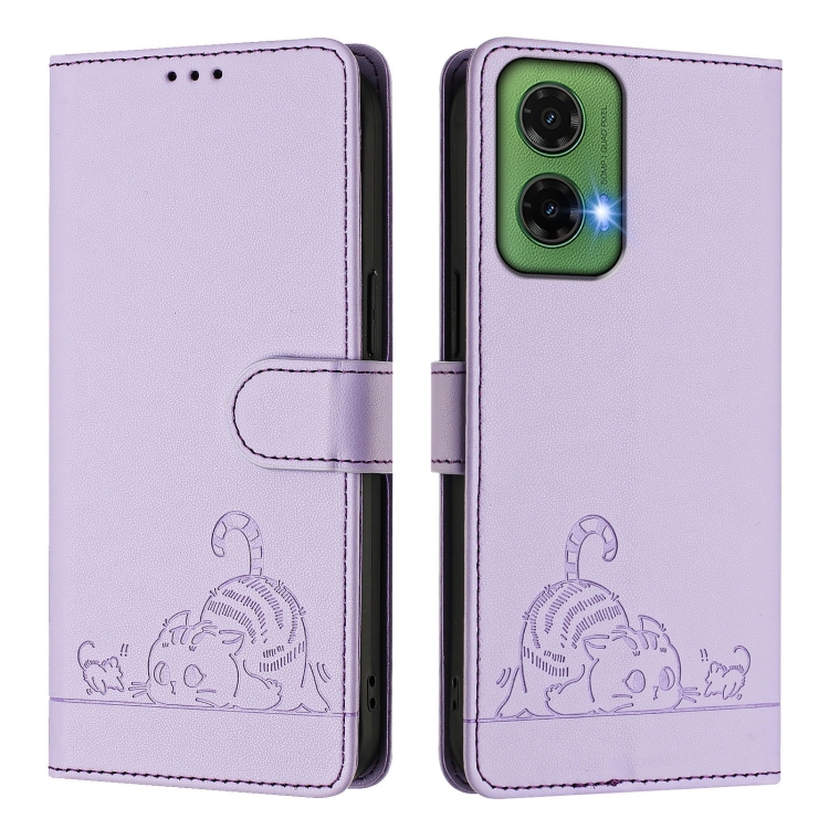 Funda de Cuero Rfid para Motorola Moto G35 con Estampado de Rata y Gato en Relieve y Cordón (Morado)