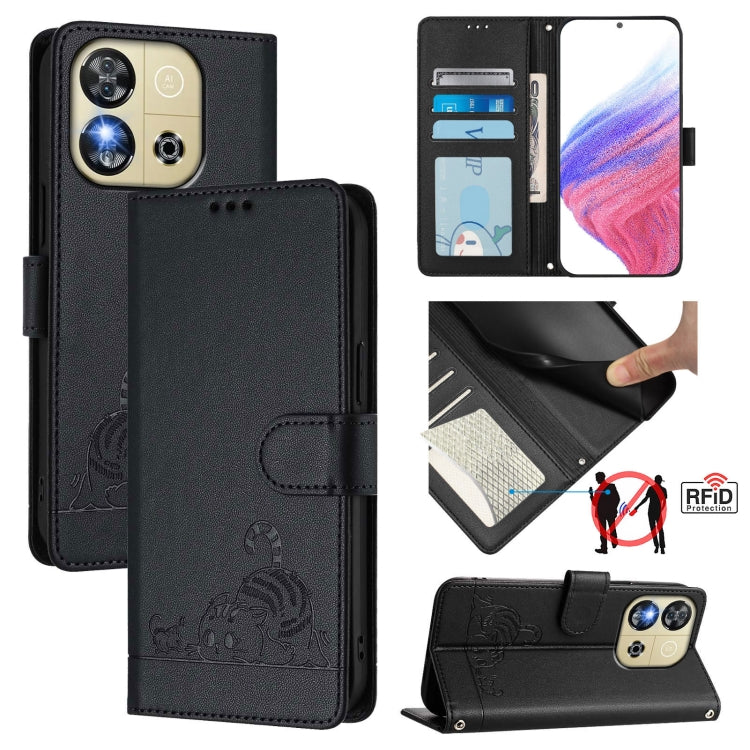 Funda de Cuero Rfid para Oukitel C57S con Estampado de Rata y Gato en Relieve y Cordón (Negro)