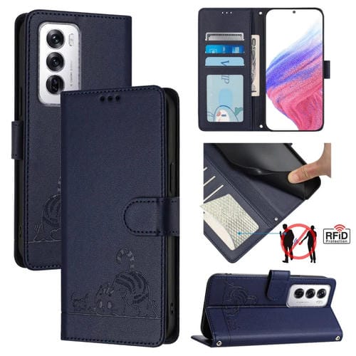 Funda de Cuero Rfid con Estampado de Rata y Gato para Oppo Reno12 Global con Cordón (Azul)