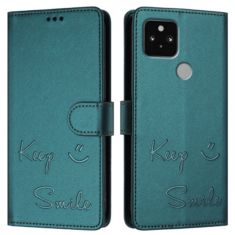 Funda de Cuero Rfid con Relieve Sonriente para Google Pixel 5 (Verde Pavo Real)