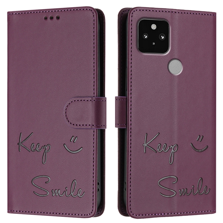 Funda de Cuero Rfid con Relieve Sonriente para Google Pixel 5 (Violeta)
