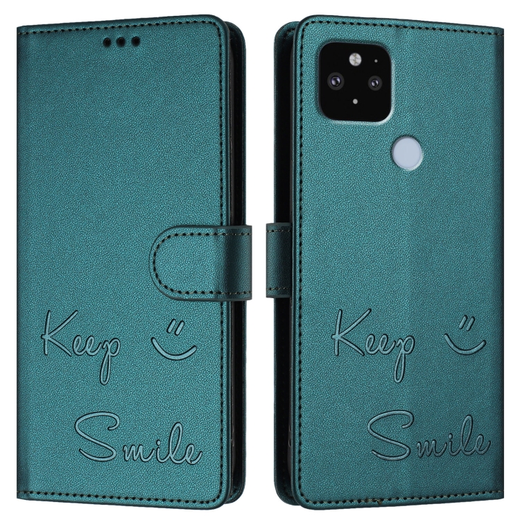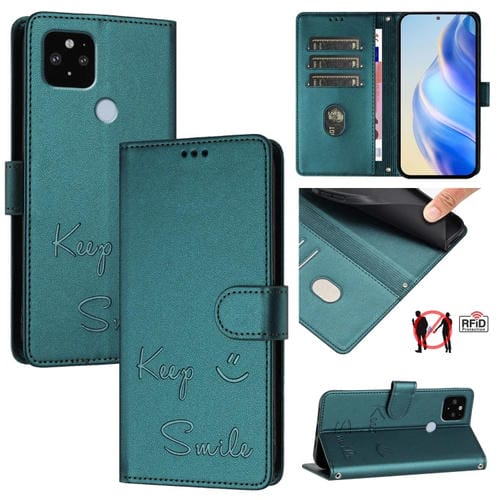 Funda de Cuero Rfid con Relieve Sonriente para Google Pixel 5 XL y Pixel 4A 5G (Verde Pavo Real)