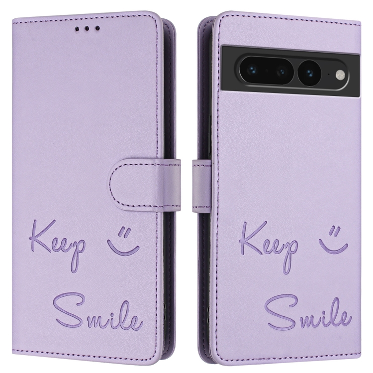 Funda de Cuero Rfid con Relieve Sonriente para Google Pixel 7 Pro (Morado Claro)