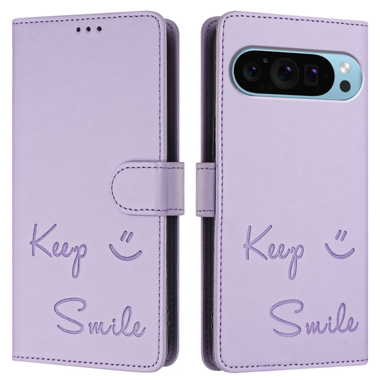 Funda de Cuero Rfid con Relieve Sonriente para Google Pixel 9 y Pixel 9 Pro (Morado Claro)