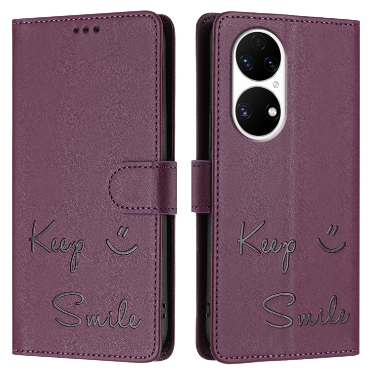 Funda de Cuero Rfid para Huawei P50 con Relieve Sonriente (Violeta)