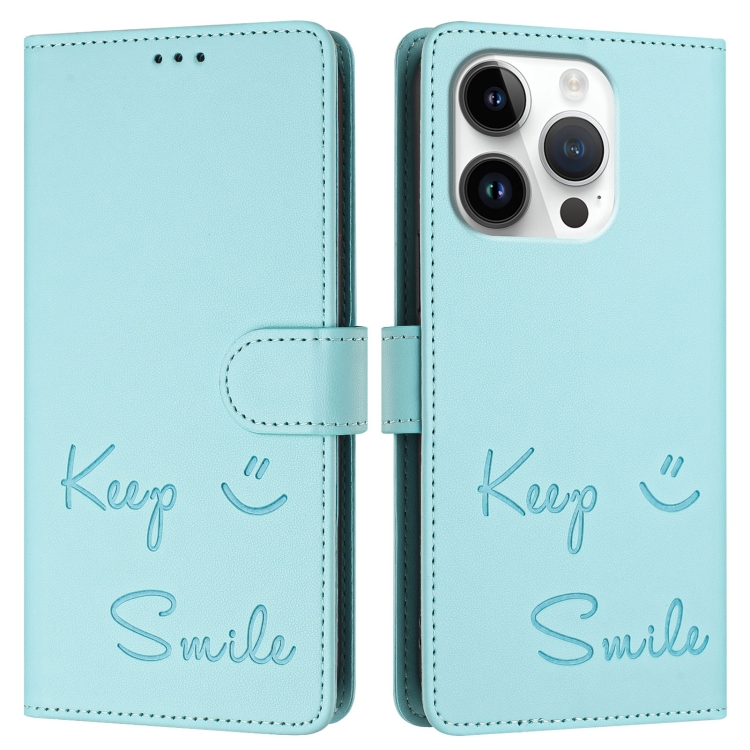 Funda de Cuero Rfid con Relieve Sonriente para iPhone 16 Pro (Verde Menta)