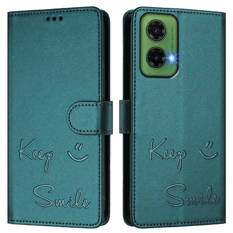 Funda de Cuero Rfid con Relieve Sonriente para Motorola Moto G35 (Verde Pavo Real)