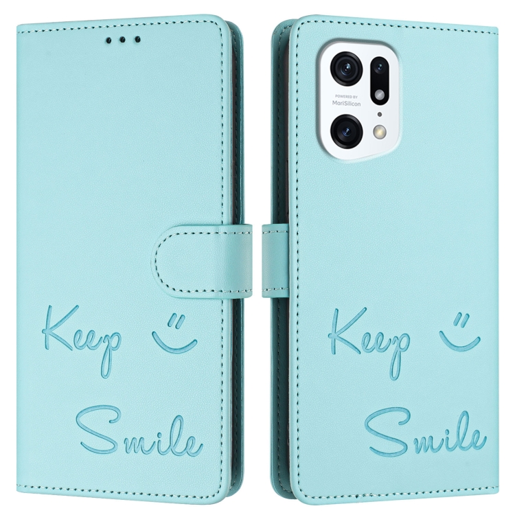 Funda de Cuero Rfid con Relieve Sonriente para Oppo Find X5 Pro (Verde Menta)