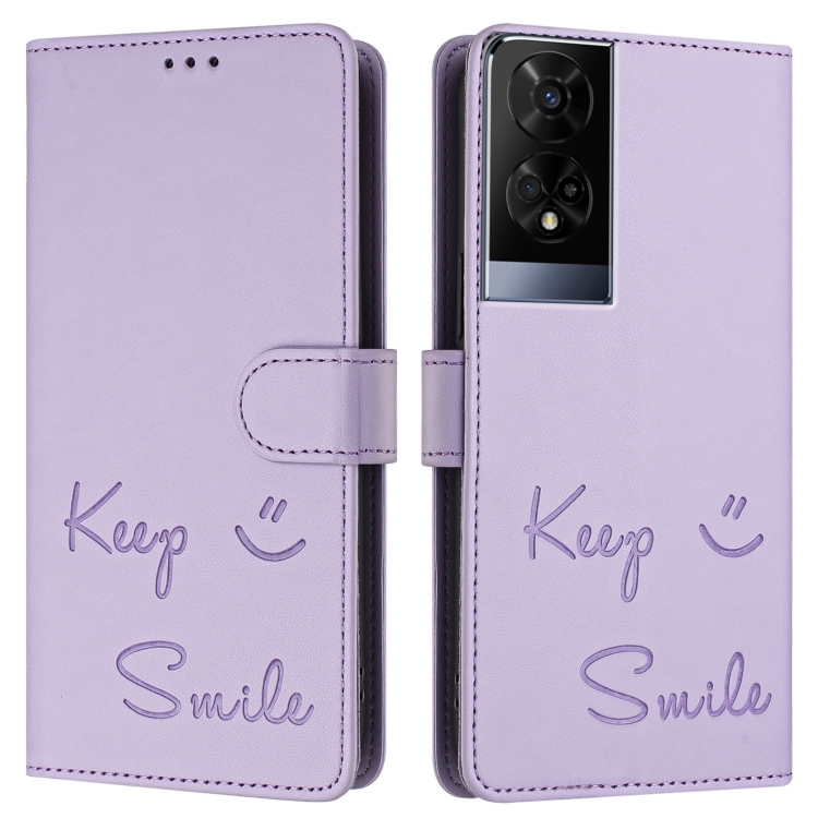 Funda de Cuero Rfid para TCL 50 Xe 5G con Relieve Sonriente (Morado Claro)