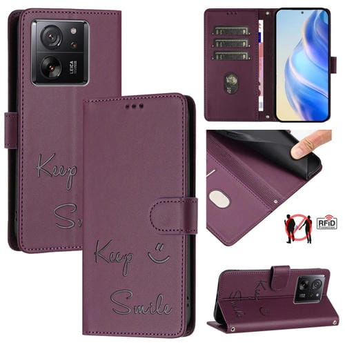 Funda de Cuero Rfid con Relieve Sonriente para Xiaomi 13T/13T Pro (Violeta)