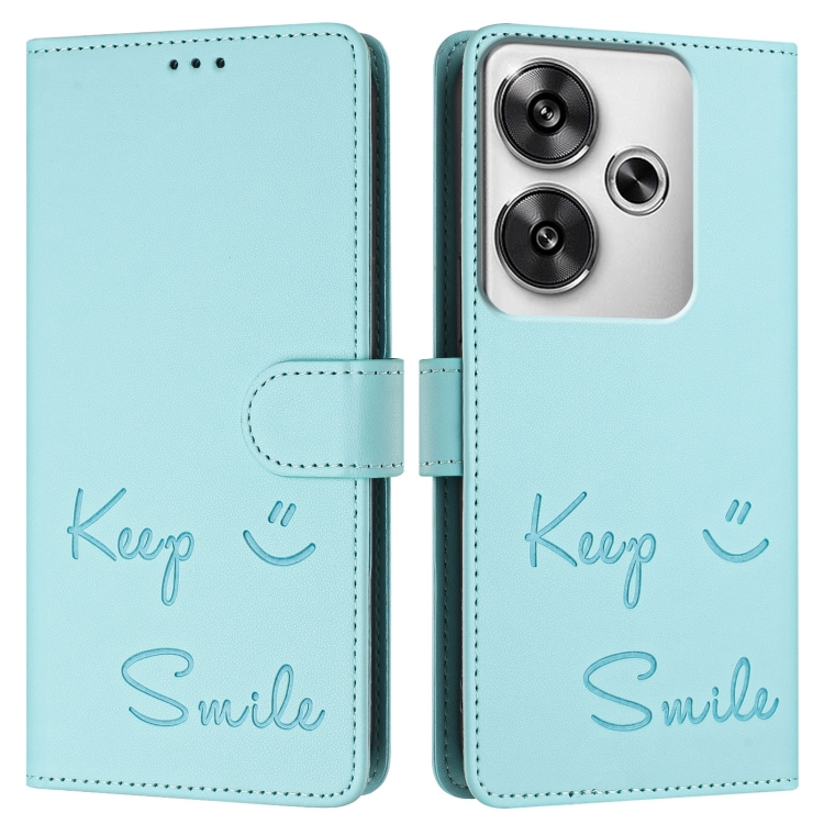 Funda de Cuero Rfid con Relieve Sonriente para Xiaomi Poco F6 5G (Verde Menta)