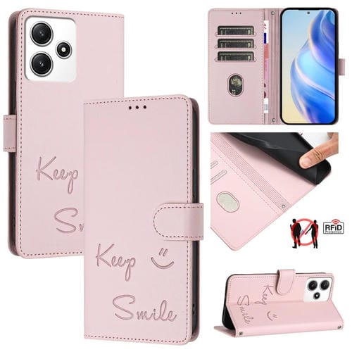 Funda de Cuero Rfid con Relieve Sonriente para Xiaomi Poco M6 Pro 5G (Rosa)