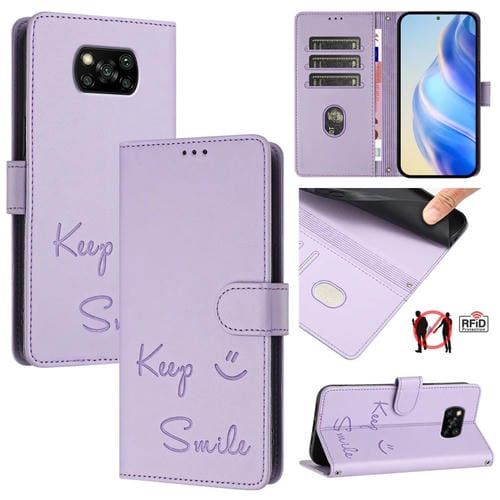 Funda de Cuero Rfid con Relieve Sonriente para Xiaomi Poco X3 / X3 Nfc / X3 Pro (Morado Claro)