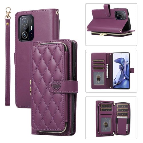 Funda de Cuero Tipo Billetera con Cremallera Completa y Diseño Rombal para Xiaomi Mi 11T/11T Pro (Morado Oscuro)