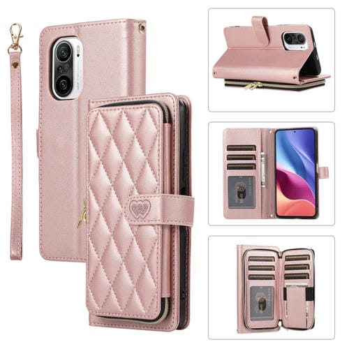 Funda de Cuero Tipo Billetera con Cremallera Completa y Diseño Romboidal para Xiaomi Poco F3 (Oro Rosa)