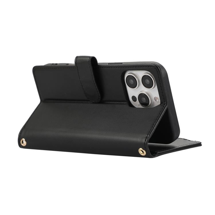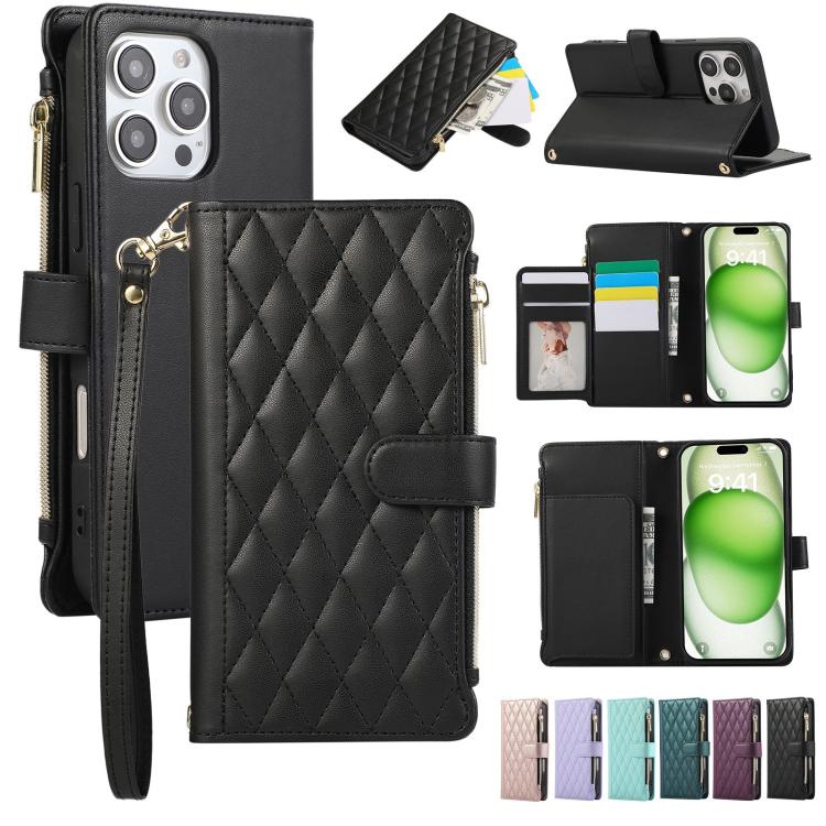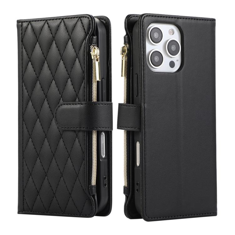 Funda de Cuero Tipo Billetera con Cremallera Rombal para iPhone 16 Pro (Negra)