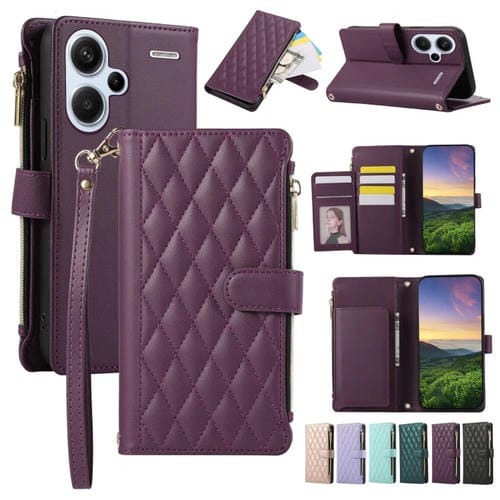 Funda de Cuero Tipo Billetera con Cremallera Rombal para Redmi Note 13 Pro+ 4G/5G (Morado Oscuro)