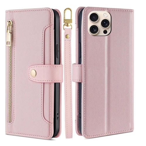 Funda de Cuero Tipo Billetera con Cremallera Diseño Cruzado Textura de Oveja para iPhone 16 Pro (Rosa)
