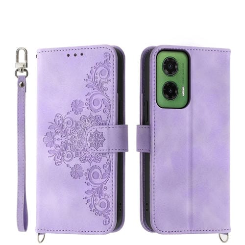 Funda Cuero Tipo Billetera Motorola Moto G55 Diseño Flores En Relieve (Morado)