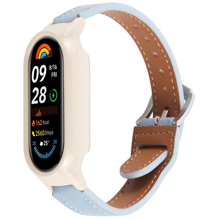 Funda de PC para Xiaomi Smart Band 9 con correa de cuero de microfibra integrada (beige y azul)
