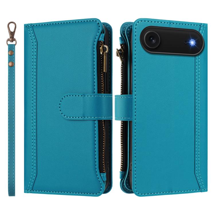 Funda de piel con cierre magnético para iPhone Air, 9 ranuras para tarjetas, cremallera y correa de mano (turquesa)