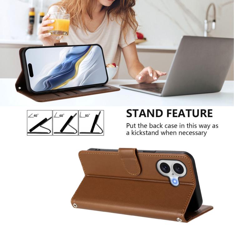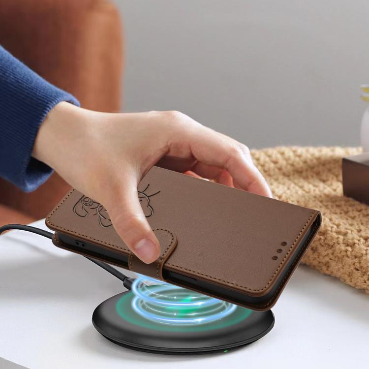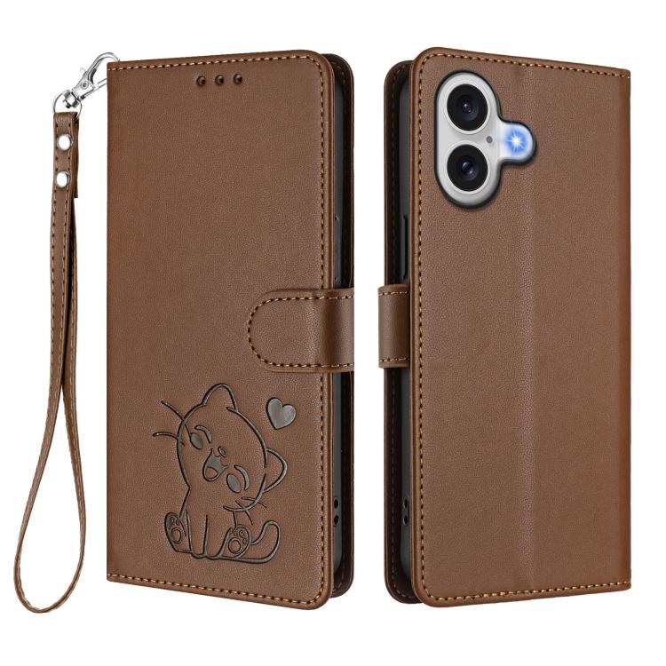 Funda de piel con diseño de gato y corazón en relieve para iPhone 17 con correa de mano (marrón)