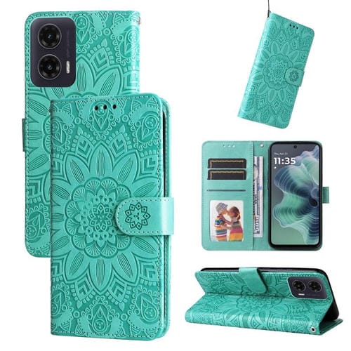 Funda de Piel Motorola Moto G35 con Diseño de Girasol en Relieve (Verde)