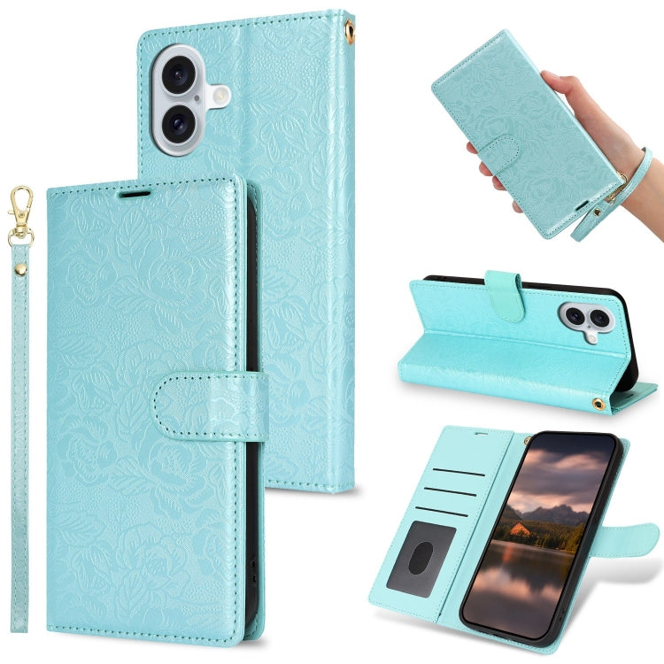 Funda de Piel con Estampado de Flores de Peonía para iPhone 16 (Azul Cielo)