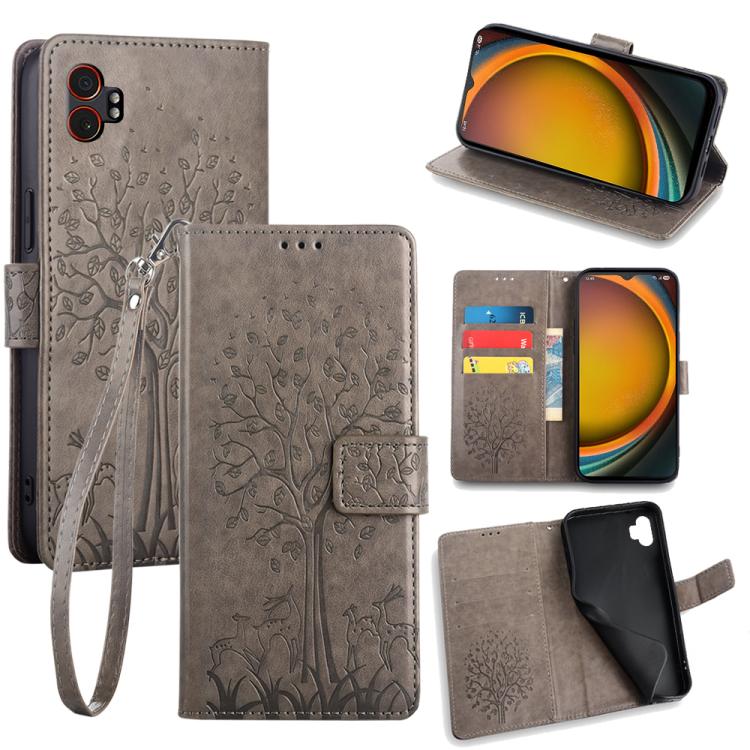 Funda de piel con relieve de árbol y ciervo para Samsung Galaxy XCover 7 Pro 5G (gris)