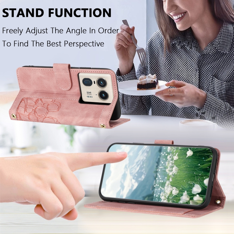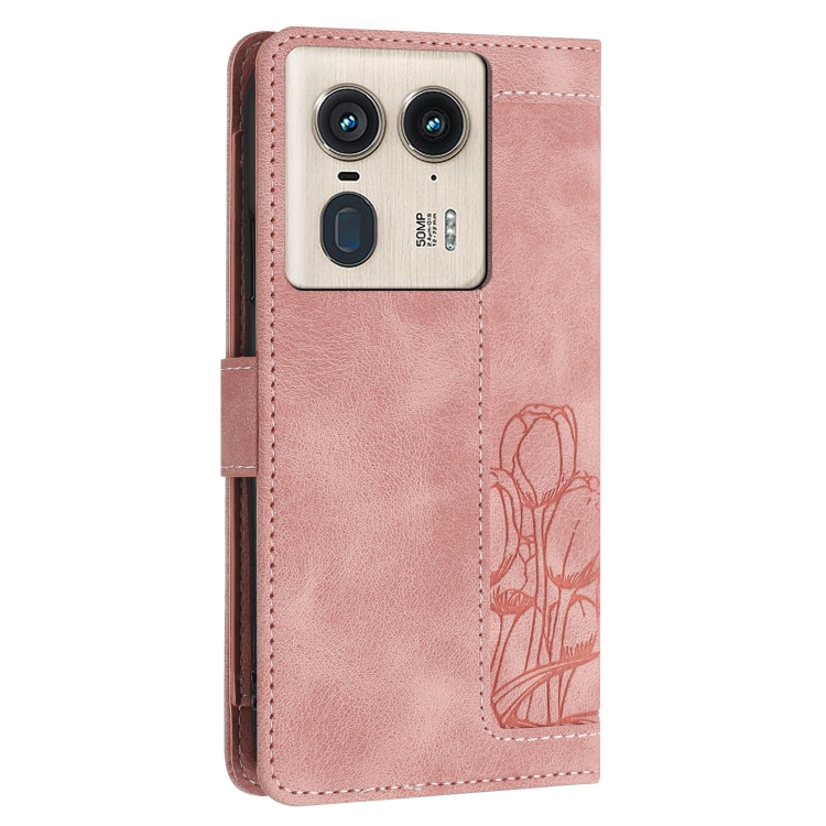 Funda de Piel con Relieve de Tulipanes para Motorola Edge 50 Ultra con Cordón (Rosa)