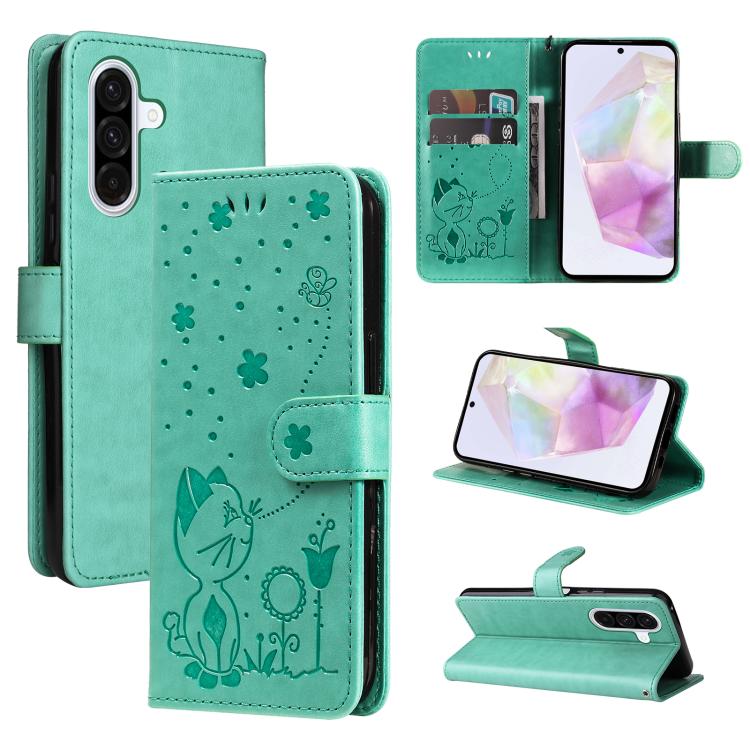 Funda de piel con tapa y diseño de gato y abeja para Samsung Galaxy A36 5G / M56 5G (verde)