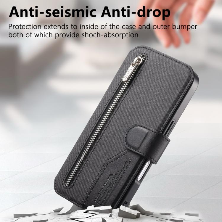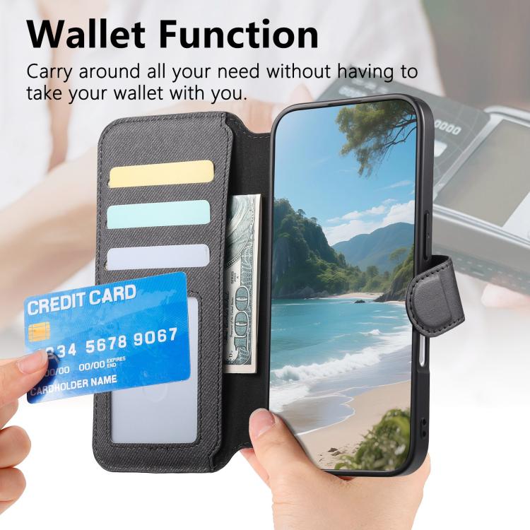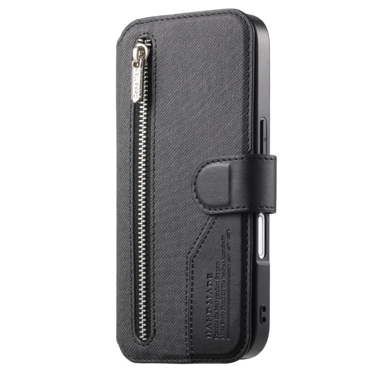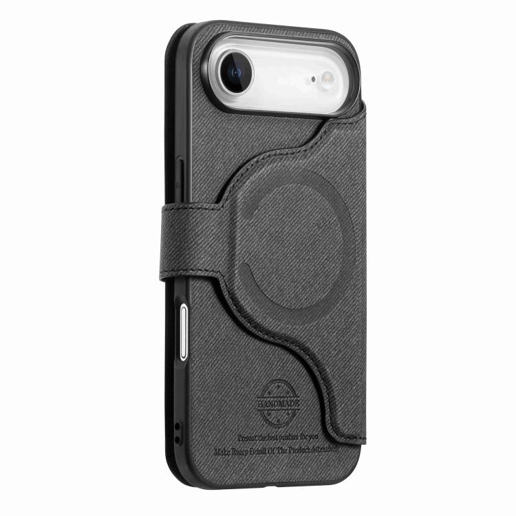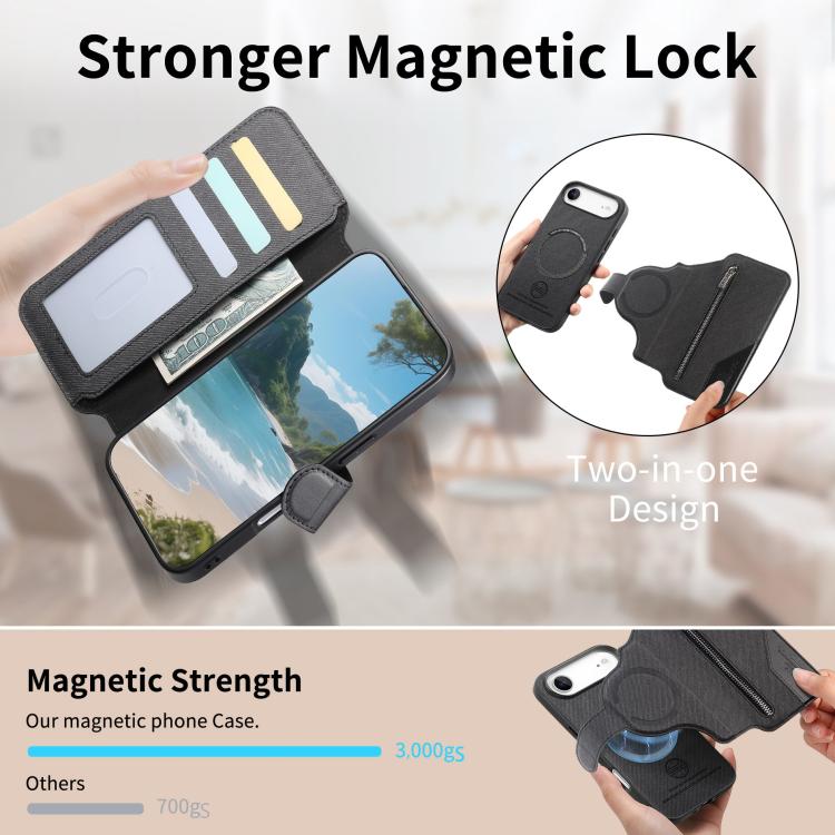 Funda de piel para iPhone Air, tipo cartera, con cremallera, MagSafe, RFID y protección antirrobo, fabricada en tejido de sarga (negra).