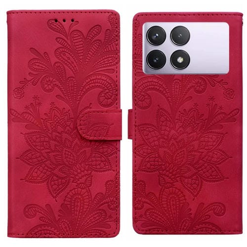 Funda de Teléfono con Hebilla Magnética de Pu con Encaje Floral En Relieve para Redmi K70E/Poco X6 Pro y Correa para la Muñeca (Rojo)