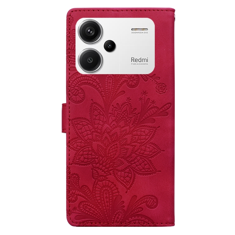 Funda de Teléfono con Hebilla Magnética de Pu con Encaje Floral En Relieve y Correa para la Muñeca para Redmi Note 13 Pro+ (Rojo)