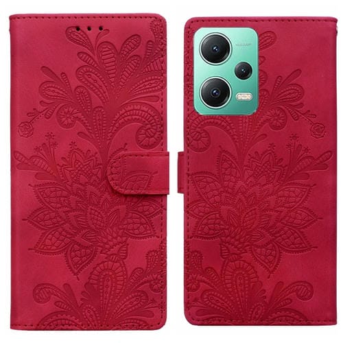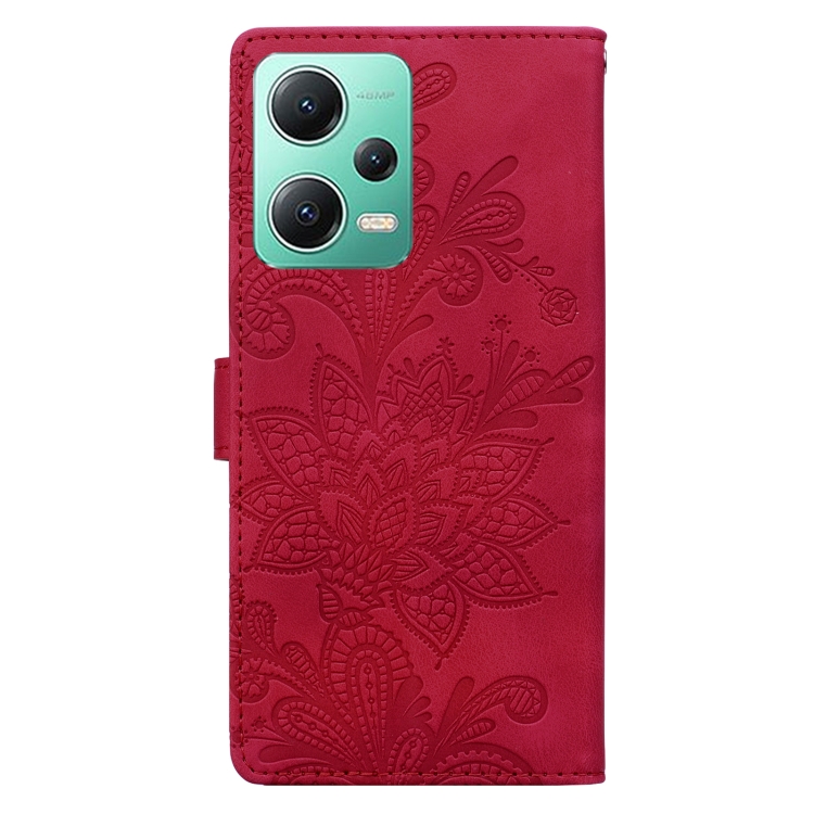 Funda de Teléfono con Hebilla Magnética y Encaje Floral En Relieve para Redmi Note 12 5G Global con Correa para la Muñeca (Rojo)
