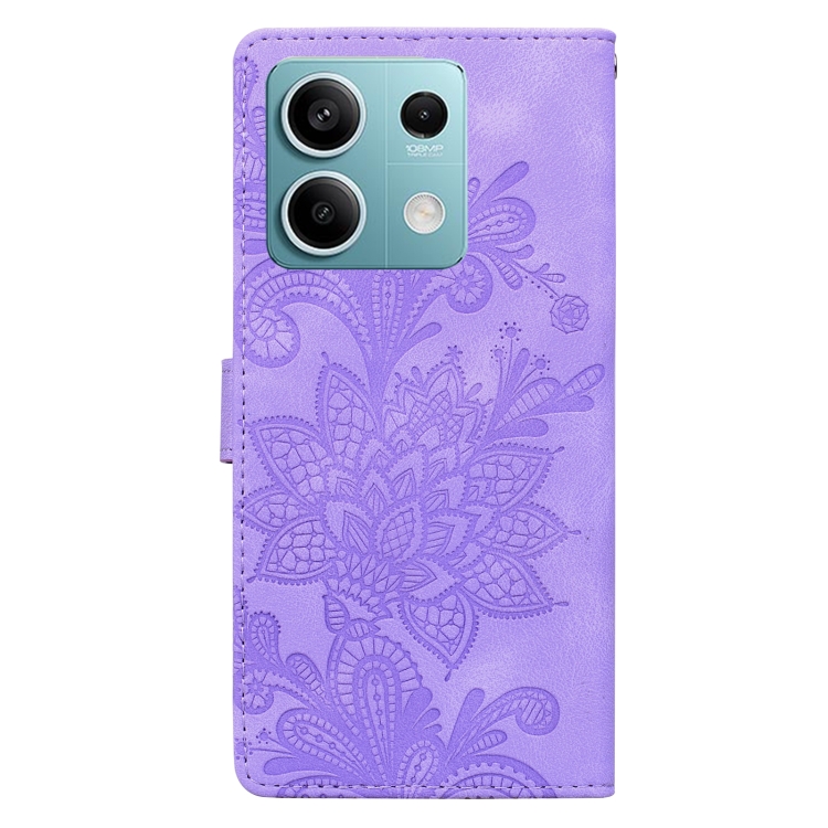 Funda de Teléfono con Hebilla Magnética y Encaje Floral En Relieve para Redmi Note 13 5G con Correa para la Muñeca (Morado)