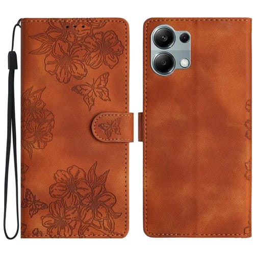 Funda de Teléfono de Pu con Relieve de Piel de Mariposa y Diseño de Flor de Cerezo para Redmi Note 13 Pro 4G (Marrón)