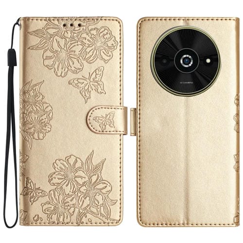 Funda de Teléfono de Pu con Relieve de Piel de Mariposa y Diseño de Flor de Cerezo para Xiaomi Poco C61 (Dorada)