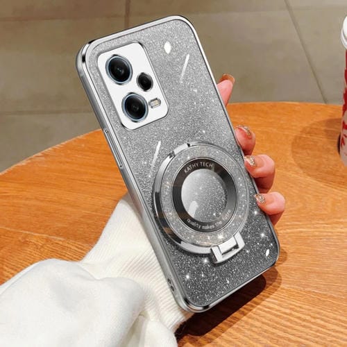 Funda de Teléfono de TPU con Soporte Redondo y Purpurina Degradada Chapada Global para Redmi Note 12 Pro 5G (Plateada)