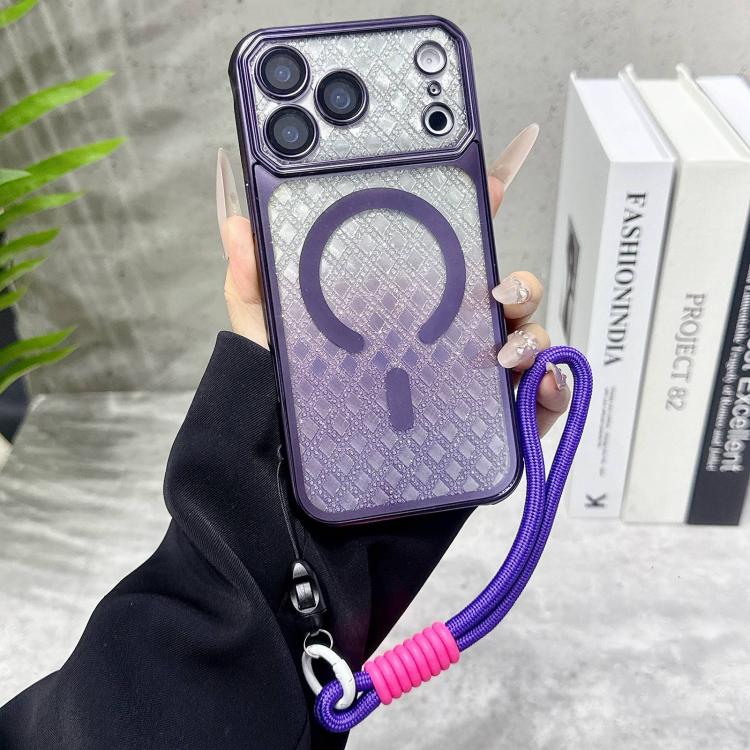 Funda de TPU MagSafe con ventana grande, diseño de rombos degradados, mate, galvanizada y con correa de mano para iPhone 17 Pro Max (morado)