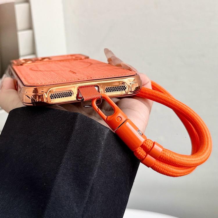 Funda MagSafe para iPhone 17 Pro Max con ventana grande de TPU galvanizado con textura de madera, con película para lente y correa (dorada)