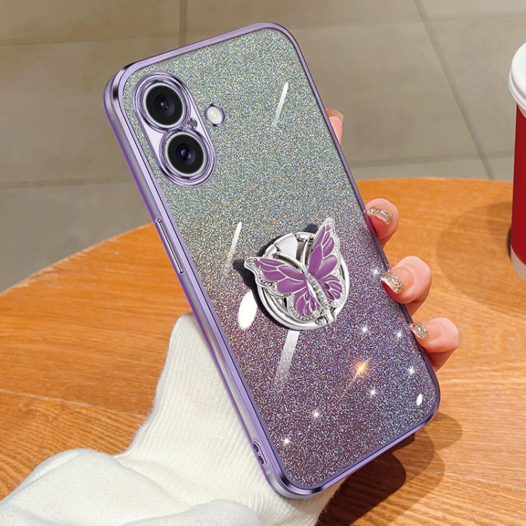 Funda para iPhone 16 TPU con Purpurina Degradada y Soporte de Mariposa (Morado)