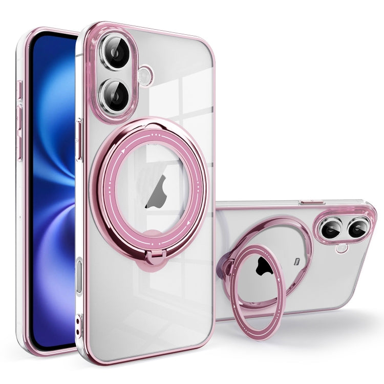 Funda para iPhone 16 con Soporte Giratorio 360 Grados y Galvanoplastia a Prueba de Golpes (Rosa)