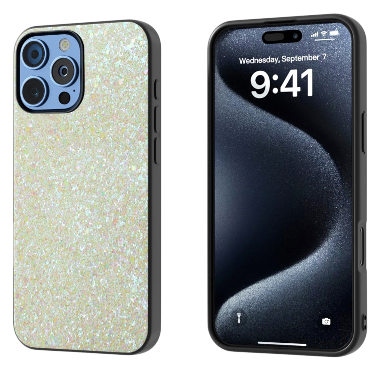 Funda para iPhone 16 Pro con Marco Negro y Purpurina de Colores (Dorada)
