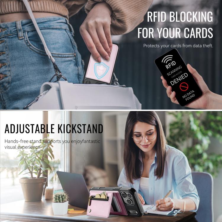 Funda para iPhone 17 Pro Max JEEHOOD J12 con cremallera RFID MagSafe y tarjetero (rosa)
