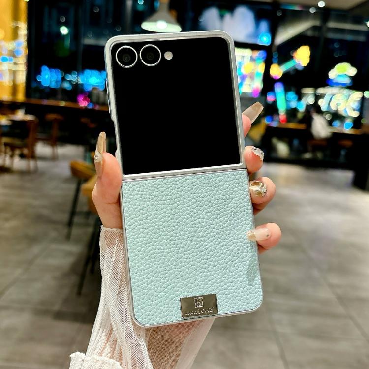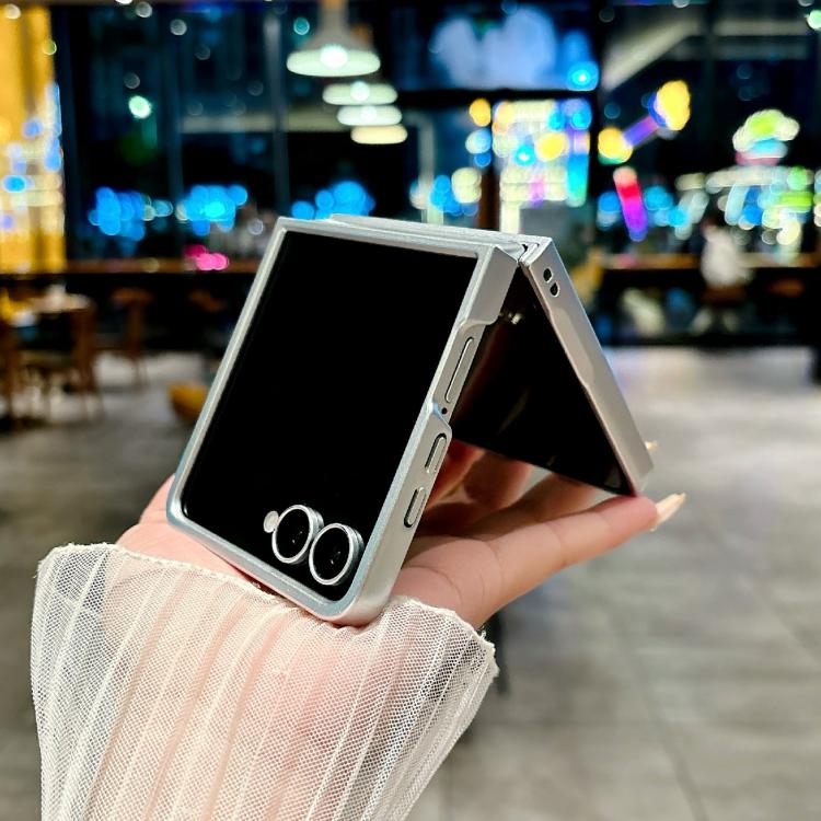 Funda para Samsung Galaxy Z Flip7 5G con marco plateado, textura de lichi y placa de identificación (azul)